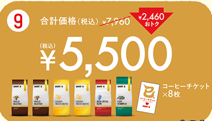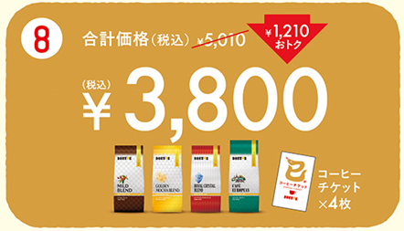 【内容】 | ・マイルドブレンド×2(各200g) ・ゴールデンモカブレンド×2(各200g) ・カフェヨーロピアン(200g) ・ロイヤルクリスタルブレンド(200g) ・コーヒーチケット×8枚 ・クロミ オリジナルグッズ |