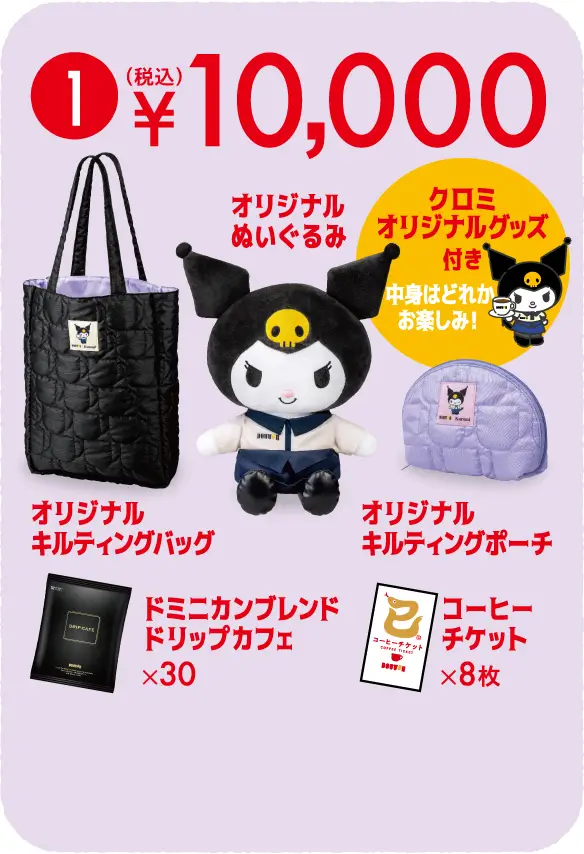 【内容】 | ・クロミ オリジナルぬいぐるみ ・クロミ オリジナルキルティングバッグ ・クロミ オリジナルキルティングポーチ ・ドミニカンブレンド カフェ×30 ・コーヒーチケット×8枚 ・クロミ オリジナルグッズ |