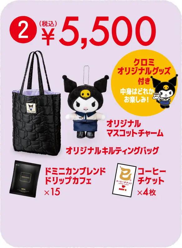 【内容】 | ・クロミ オリジナルマスコットチャーム ・クロミ オリジナルキルティングバッグ ・ドミニカンブレンド カフェ×15 ・コーヒーチケット×4枚 ・クロミ オリジナルグッズ |