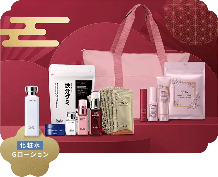 【内容】 | ・Gローション(化粧水) 180mL ・薬用ホワイトレディ(美容液)[医薬部外品] 60mL ・リフトアップセラム(美容液) 30mL ・高品位「スクワラン」(化粧オイル) 15mL ・ナイトリカバージェリー(夜用ジェル美容液) 25g(限定サイズ)・スパチュラつき ・オイルクレンジング(メイク落とし) 7mL×7包 ・鉄分グミ(栄養機能食品) 150g(約30粒)・約10日分 ・ジャスミン・ローズ ルミエールマスク(シート状全顔美容液マスク) 7枚入り(チャックつきパウチ) ・海の宝石 紅潤スティック(スティック状スクワラン) 6.8g ・さらさらしっとりヘアオイル(ジャスミン・ローズ)(髪用美容オイル) 28mL ・スクワランハンドセラム(ジャスミン・ローズ)(ハンド用美容液) 50g ・キャリーオンバッグ |