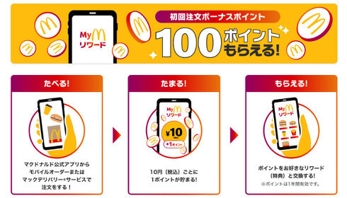 マクドナルド公式アプリでの注文(モバイルオーダー・マックデリバリー)で、10円(税込)ごとに1ポイントが貯まるリワード制度です。