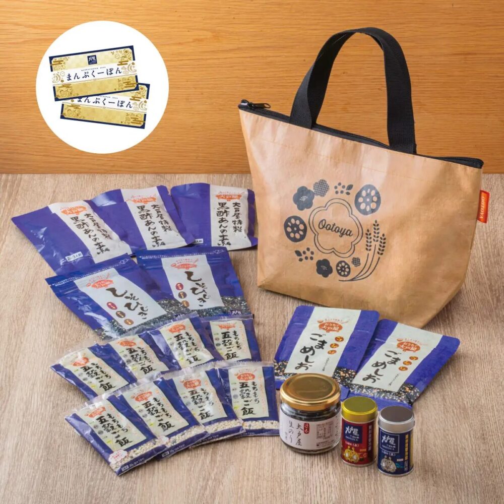 | 【内容】 | ・まんぷくーぽん 3,000円分 × 2冊 (計6,000円分) 〈5,250円相当の大戸屋オリジナル商品〉 ・八幡屋礒五郎コラボ七味 1箱(2個セット) ・大戸屋特製黒酢あんの素(2~3人前) 3袋 ・しそひじき(50g) 2袋 ・もちもち五穀ご飯(30g) 8袋 ・ごまめしお(30g) 2袋 ・大戸屋 生のり佃煮(100g) 1個[NEW] ・ 大戸屋オリジナルお弁当バッグ 1個[NEW] |