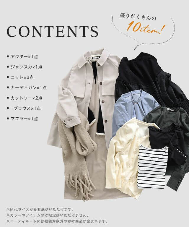 | 【内容】 | ・アウター ・ジャンスカ ・ニット3点 ・カーディガン ・カットソー2点 ・Tブラウス ・マフラー |