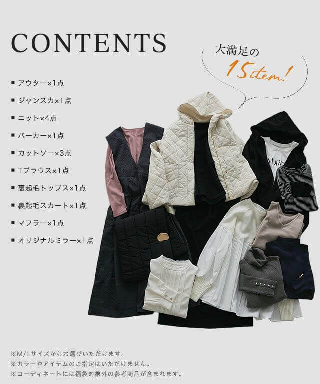 | 【内容】 | ・アウター ・ジャンスカ ・ニット4点 ・パーカー ・カットソー3点 ・Tブラウス ・裏起毛トップス ・裏起毛スカート ・マフラー ・オリジナルミラー |