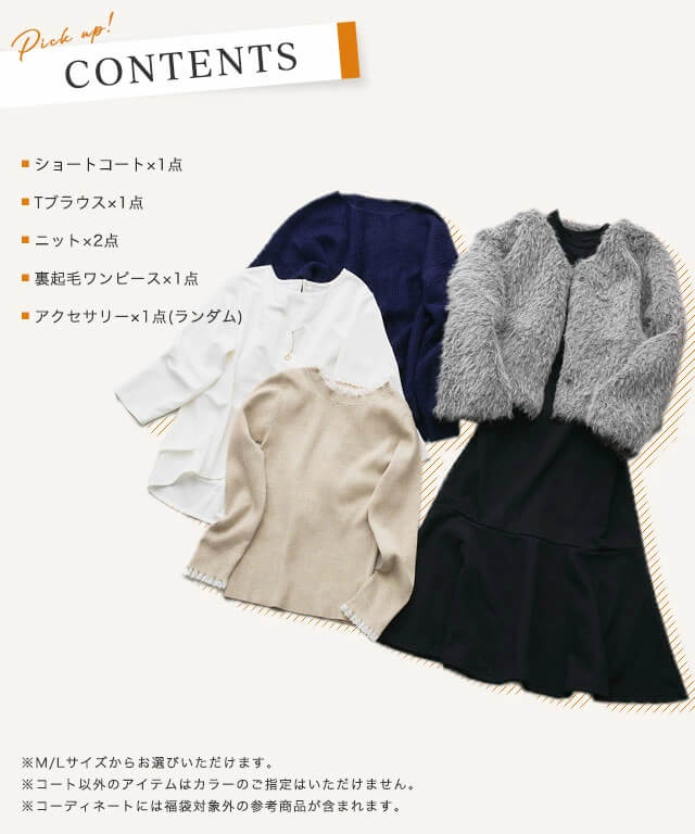 | 【内容】 | ・ショートコート ・Tブラウス ・ニット2点 ・裏起毛ワンピース ・アクセサリー(ランダム) |