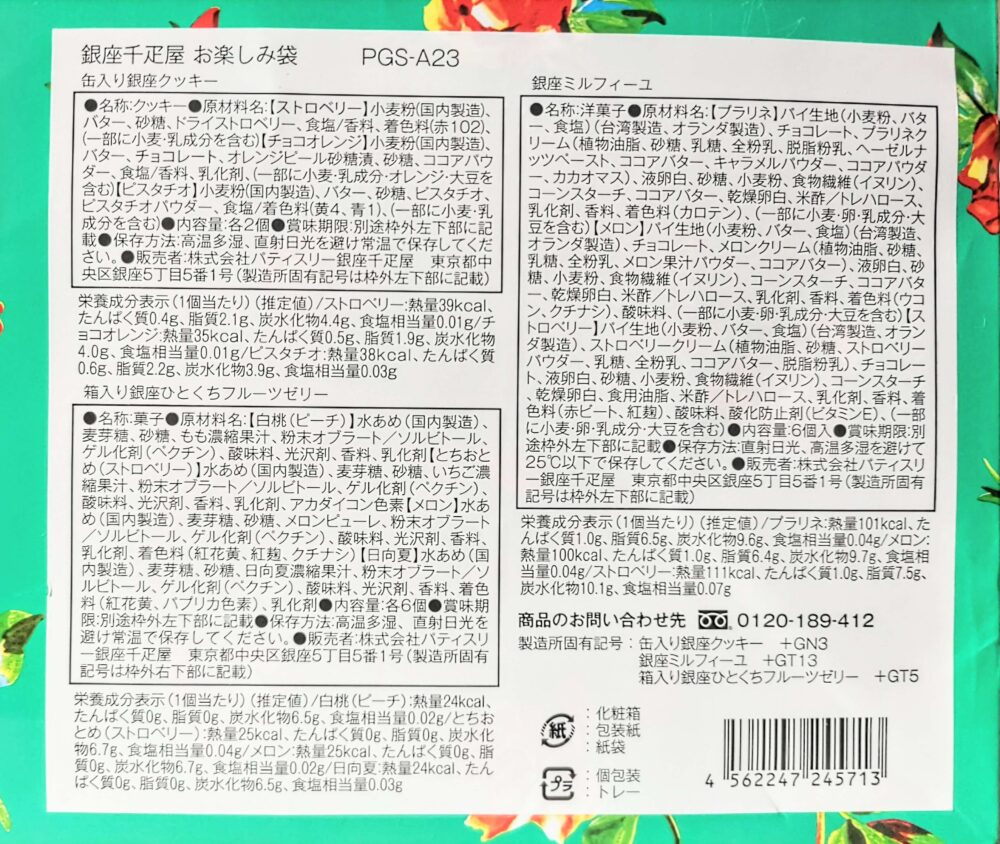 | 【内容】 | ・銀座フルーツジュレ3個入り ・銀座焼きショコラサブレ8個入り ・銀座フルーツサンド6個入り |